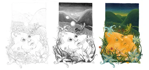 The idea in this series was to depict each celestial body exhibiting emotions I typically associate with them, and hosting a sort of animal guide. For the star, I wanted to express a sense of curiosity, wishing, and wonder. Naturally, his animal guide is a cricket, reminiscent of Jiminy from Pinocchio. This painting asks: what if a star was looking up at the night sky, amazed by the vastness and beauty of it all, perhaps in realization that he is also a part of the intricate mechanical workings of the universe? What if he was wishing on things composed of the substance of which he also is made? If we are made of the same stuff as well, perhaps we have all the necessary parts to make our own wishes and dreams come true.
